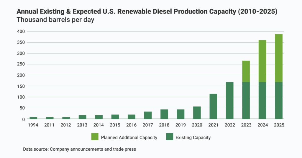 According to the U.S. Energy Information Administration, “U.S. production capacity for renewable diesel could more than double from current levels by the end of 2025, based on several announcements for projects that are either under construction or could start development soon.”